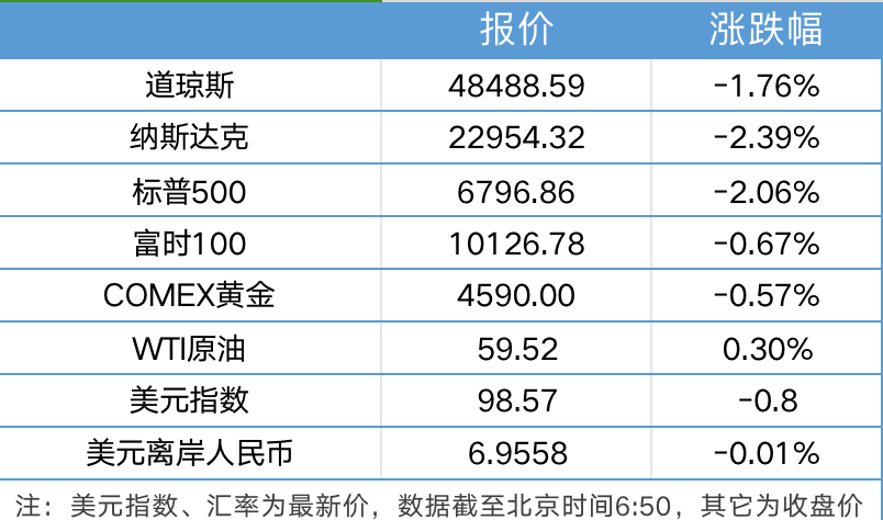 1、美国市场再现“股债汇”三杀。美股三大指数大幅收跌,道琼斯指数跌1.76%,标普500指数跌2.06%并创去年10月以来最大单日跌幅,纳斯达克综合指数跌2.39%;科技股普跌,甲骨文、博通跌超5%,英伟达、特斯拉跌超4%,亚马逊、苹果跌超3%。
