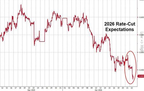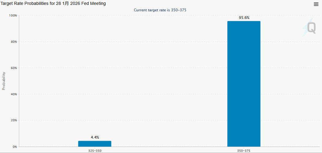 在去年底连续三次将联邦基金利率目标区间下调25个基点后,目前多数美联储官员暗示倾向于在下周1月27-28日的下次会议暂停降息。短期利率期货合约也显示本月降息概率极低,根据芝商所的美联储观察工具,美联储在本月晚些时候降息的概率仅为4.4%。